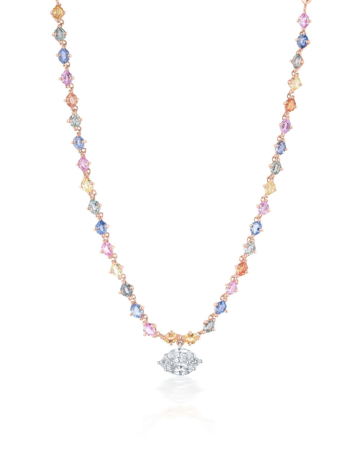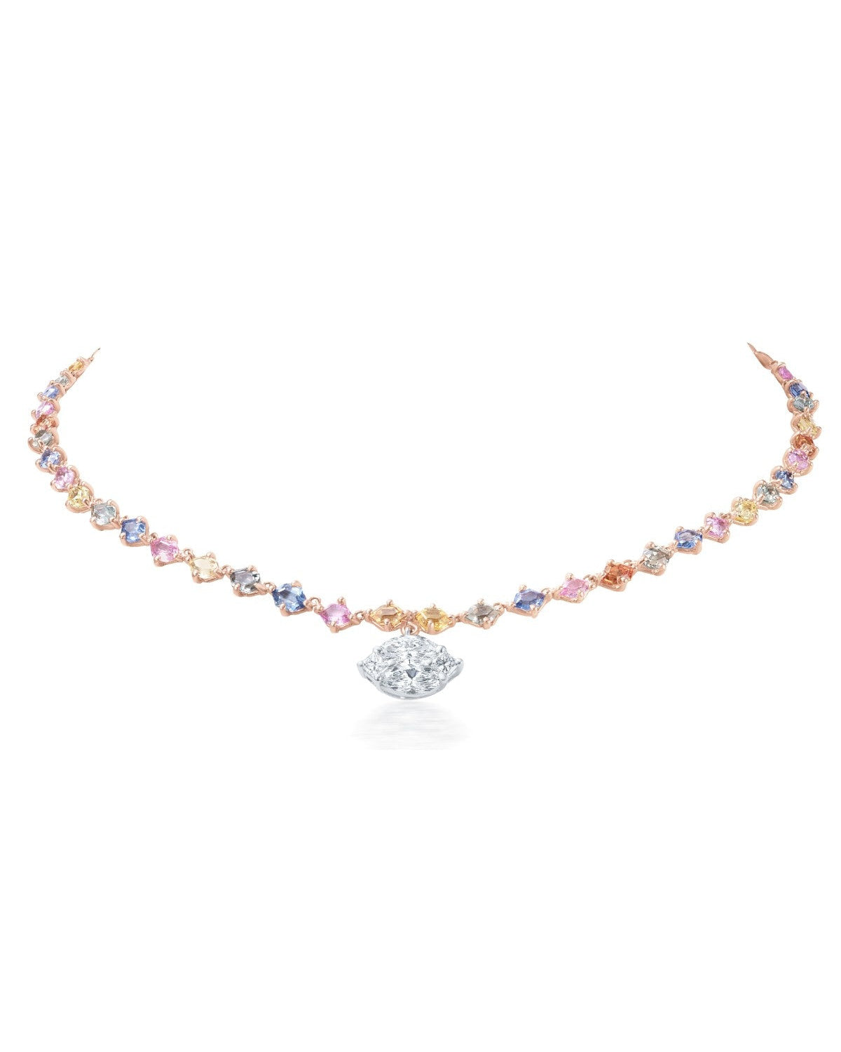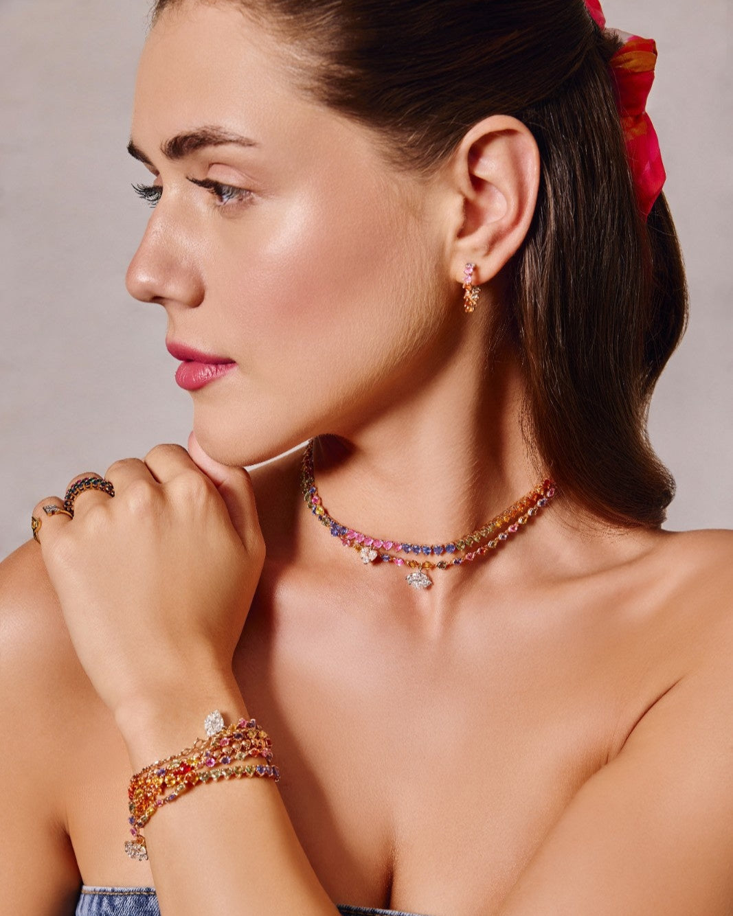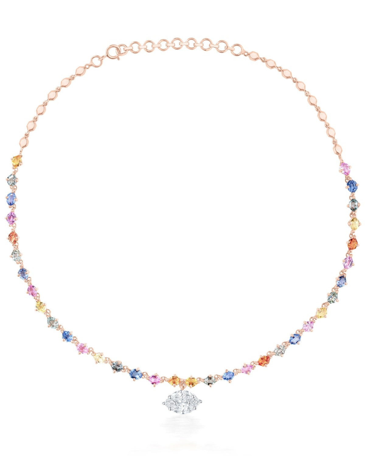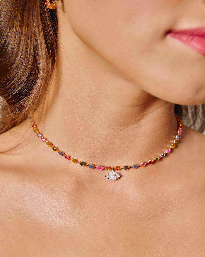 Like a jeweled rainbow arching across the sky, this necklace flows with a spectrum of vibrant hues, each stone alive with brilliance. A celebration of color and light, it embodies the joy and radiance of La Dolce Vita.